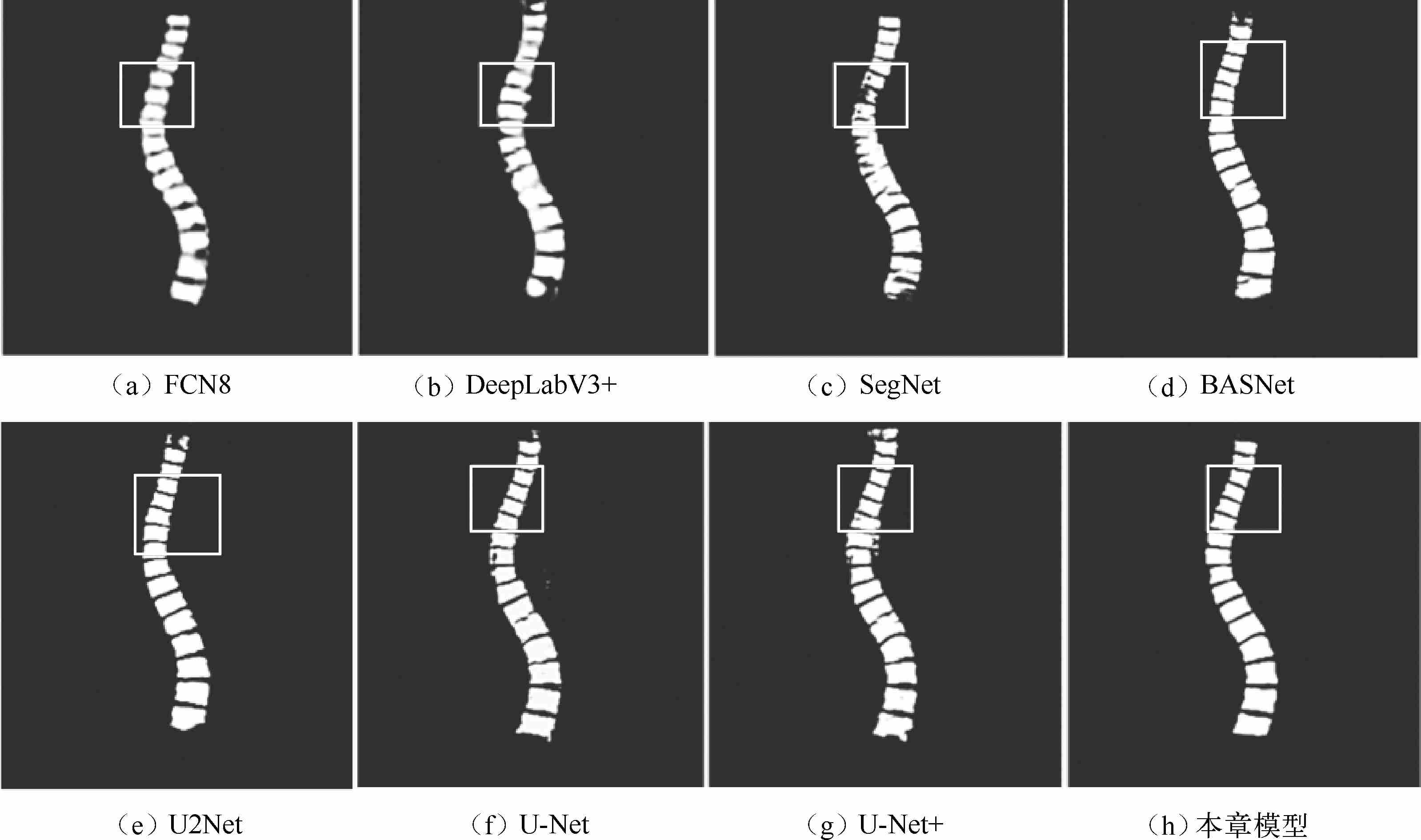 不同模型分割结果比较如图2.11所示。可以看出,FCN8、DeepLabV3+和SegNet的分割结果较为模糊,且出现了大面积的椎体粘黏以及误分割的情况,而对于U-Net、U-Net++、BASNet以及U2Net,虽然其分割结果优于前面几个模型,但还是出现了不同程度的误分割情况,主要出现在椎体的顶部和尾部。从分割结果看出,本章提出的模型的分割性能高于其他模型。