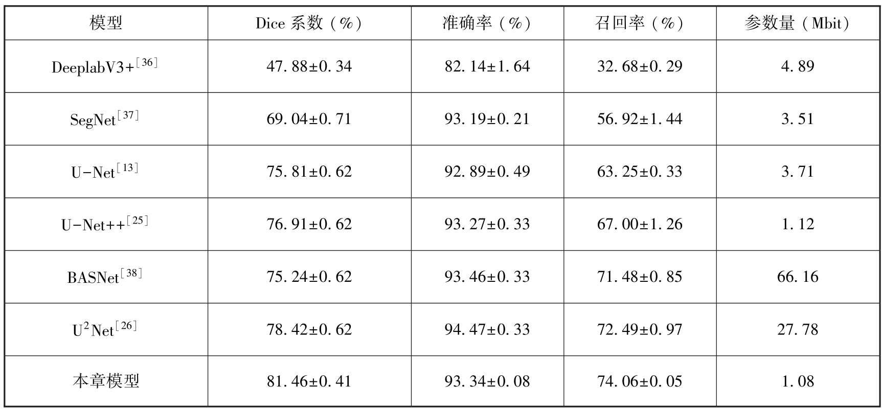 进一步将本章提出的方法与已有的分割模型进行比较,Dice系数等结果及参数量见表2.3。由表2.3可以看出,相对于FCN8s [24] 、DeepLabV3+ [36] 、SegNet [37] 、U-Net [13] 、U-Net++ [25] 、BASNet [38] 和U2Net [26] 的模型,本章方法的Dice系数分别提高了32.03%、33.58%、12.42%、5.65%、4.55%、6.22%和3.04%。并且本章模型中的参数比其他网络的参数小一个数量级。实验结果表明,本章提出的方法分割精度较高,相比于其他现有的模型参数量也相对较小。