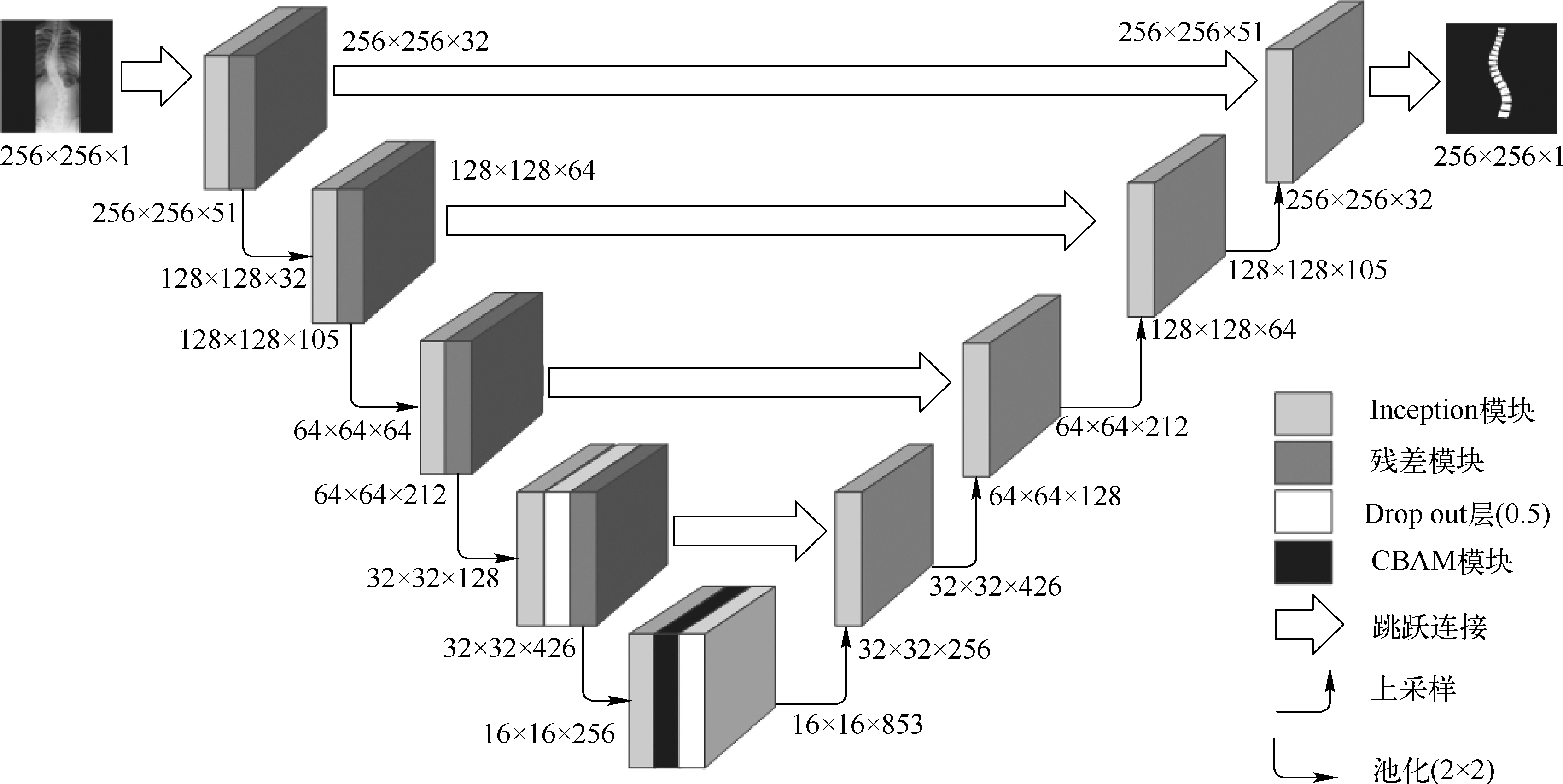 本章提出的改进的U-Net分割网络结构图如图2.6所示,这是在U-Net模型的基础上改进而来的。输入图像的大小为256×256,训练图像只有一个通道。本章采用了可以实现多尺度卷积的Inception模块 [33] 替换了U-Net的下采样卷积核,并在Inception模块的后面加入了残差模块用于解决多尺度特征提取训练时可能存在的梯度爆炸和梯度消失问题。输入的图像经过4次下采样操作后,特征图的大小逐渐减小,深层的特征也逐渐被网络提取。在网络的瓶颈层,加入了卷积块注意力模块(Convolutional Block Attention Module,CBAM) [34] ,用于网络特征提取的注意力监督。通过跳跃连接路径,对浅层特征与上采样恢复的特征进行融合。最后经过4次上采样,特征图恢复了原图大小并最终输出分割结果。