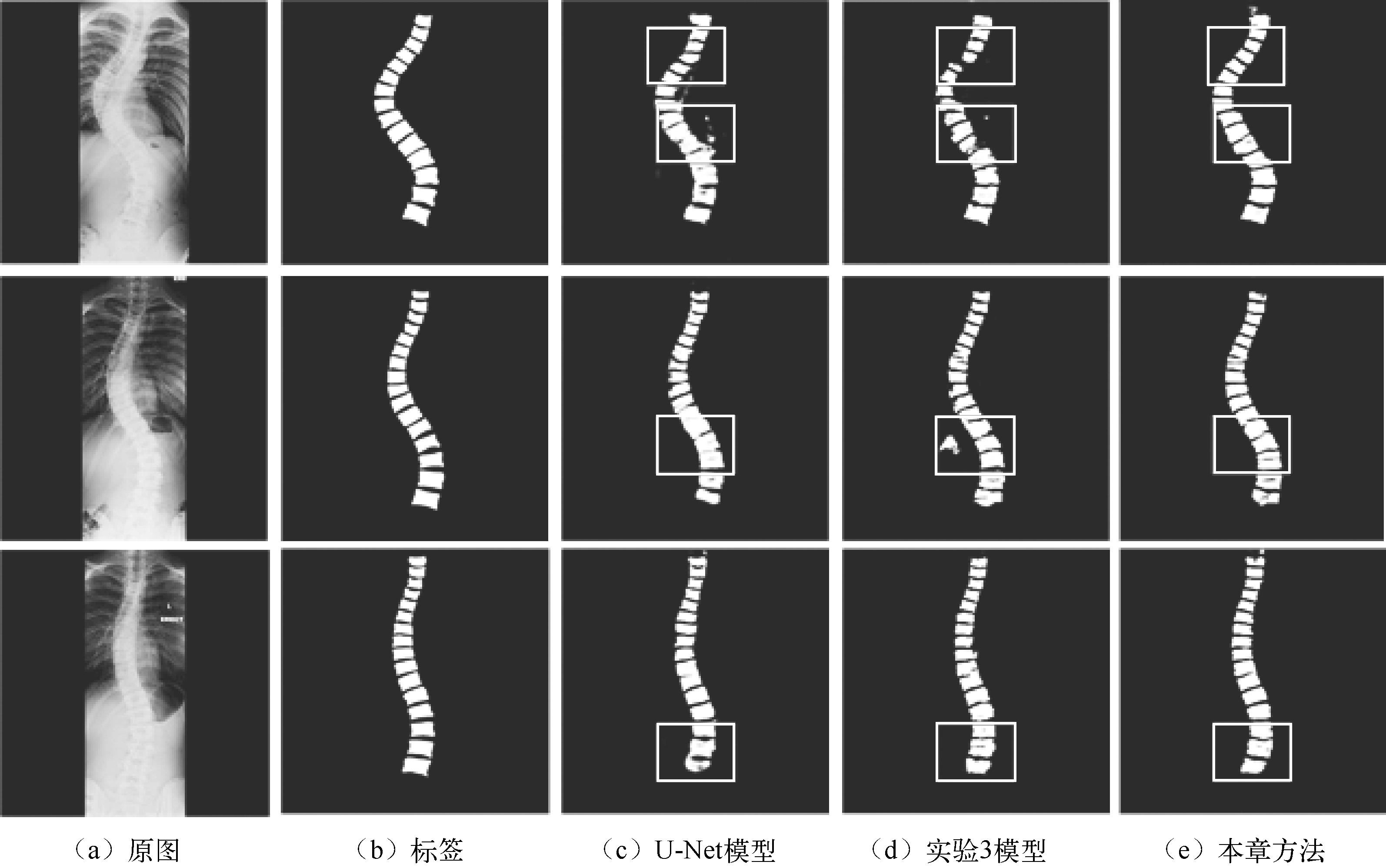 消融实验分割结果可视化如图2.10所示。不同方法获得结果之间的主要差异在图像上用方框标出。从图2.10可以看出,本章模型的分割结果误差更小,分割结果接近测试集的真实标签,与原始U-Net模型相比,分割结果有明显改善。