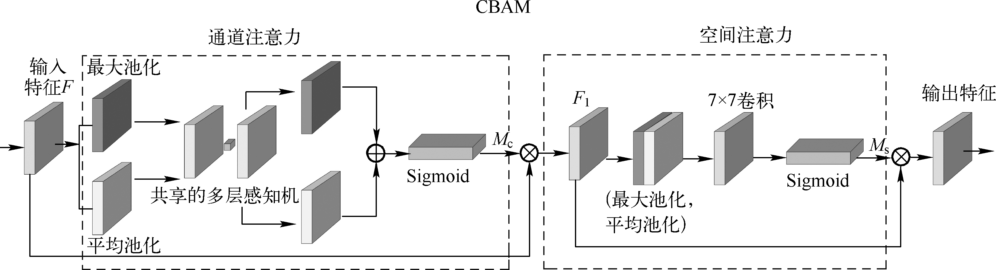 式中:⊗表示特征图逐个元素相乘,在这个过程中,注意力的权重沿着通道维度和空间维度传递; F 2 是最终的特征图输出。