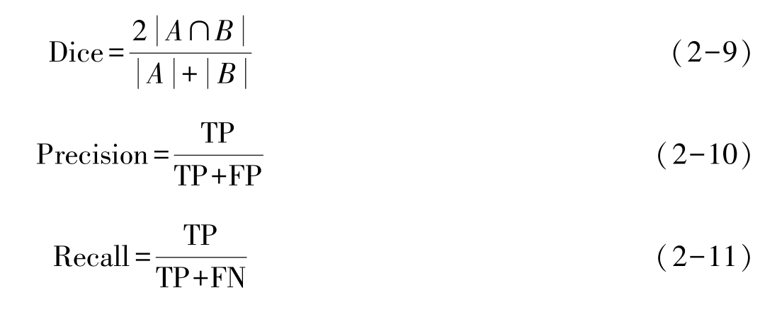 使用Dice系数、精确度(Precision)和召回率(Recall)作为性能评价指标来评估分割结果可靠性和准确性,这些参数分别定义为