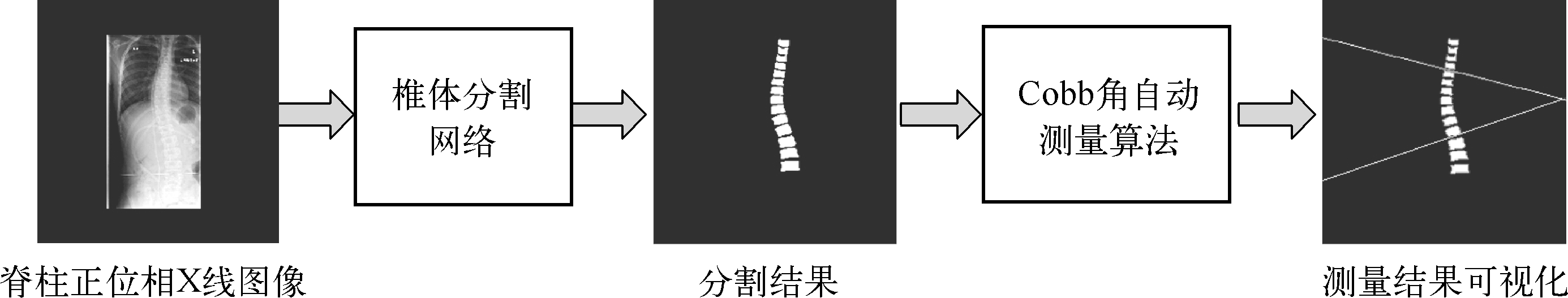 本章提出的基于脊柱X线图像分割的Cobb角测量过程如图2.1所示。首先将脊柱X线图像输入到分割网络中,分割脊柱各椎体。然后根据椎体分割结果测量Cobb角,并实现测量结果的可视化。