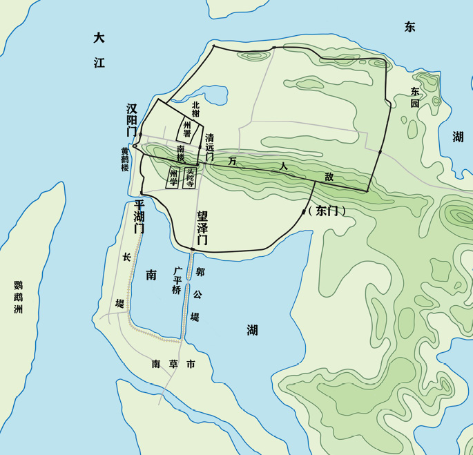 从其他文献的记载来看,在南宋中叶以前,鄂州城垣至少在部分地段仍是存在的,也设有一些城门。明代《湖广图经志书》里提到的三座城门中,平湖门应与明清武昌城平湖门同名同址,是鄂州外郭的一座西门;望泽门南临宋代“南湖”,是外郭南门。而关于清远门,文献中记载较为模糊,此门或非鄂州外郭城门,而是子城东门。南宋时期编纂的地理总志《舆地纪胜》,在有关荆湖北路鄂州城的章节中,有两处记载提到清远门。一处称荆湖北路转运司东西二衙“在州之清远门内”,表明清远门应是“州城”之门,而“州城”就是子城。该书又有记载称“头陀寺,在清远门外黄鹄山上”