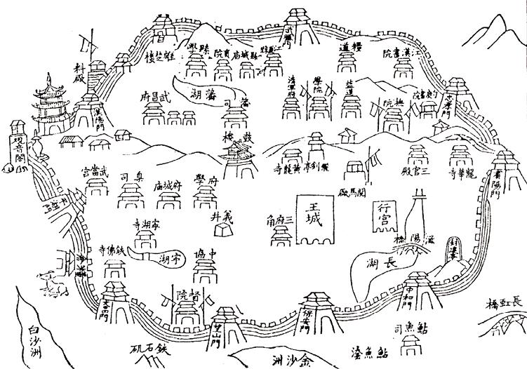楚王就藩和楚王府的建造,是明初武昌进行大规模城垣扩建的主要原因。在唐宋时期,鄂州城的主要城区位于蛇山以北,山南沿江一带的南草市等地虽然十分繁华,但乃是位于城墙之外的近郊地带。明代楚王府选址蛇山南麓,势必需要对城池进行南拓。据《湖广图经志书》记载:“本朝洪武四年,江夏侯周德兴因旧城增筑之。城周围三千九十八丈……门曰大东、小东、新南、平湖、汉阳、望山、保安、竹簰、草埠,共九门。”