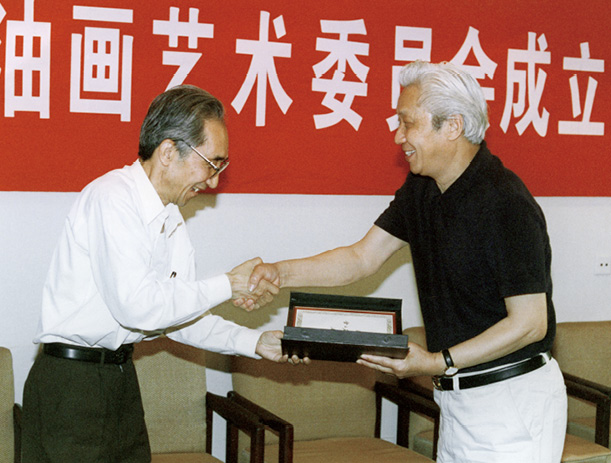 1998年,中国美术家协会油画艺术委员会成立,全山石(右)接受靳尚谊主席(左)聘书