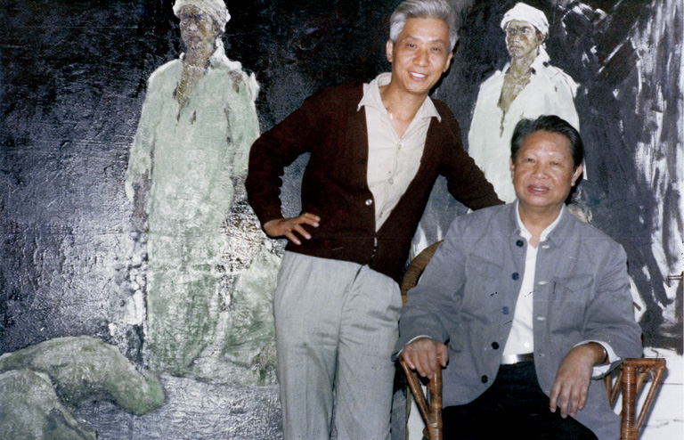 1976年,重画《前赴后继》,全山石(左)与罗工柳(右)合影