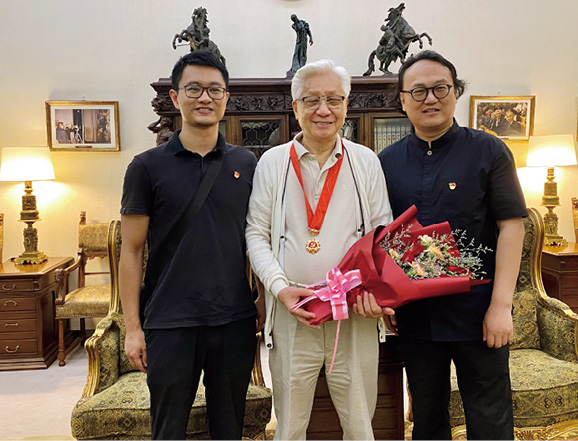 2021年6月30日,高世名(右1)、沈世龙(左1)看望全山石先生,并颁发“光荣在党50年”纪念章