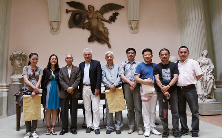2011年,意大利博洛尼亚美术学院院长(左4)授予全山石(左5)、靳尚谊(左3)艺术成就奖,陪同人员有张祖英、雷波等