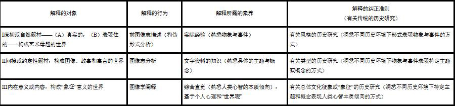 综上所述:当我们想非常严谨地表达自己的思想时(当然这在我们日常交谈和写作中并不总是必要的,因为此时一般的上下文便使所用词语的意义显得非常清楚),我们必须区分题材或意义的三个层面,最低的层面通常混同于形式,第二个层面是不同于图像学的图像志的专门领域。无论我们涉足于哪一层面,我们的鉴别与解释都有赖于个人的素养,也正是出于这一原因,我们的鉴别与解释又须得到补充和纠正,这种补充和纠正凭借着对历史进程的洞悉,而一切的历史进程均可被称为传统。