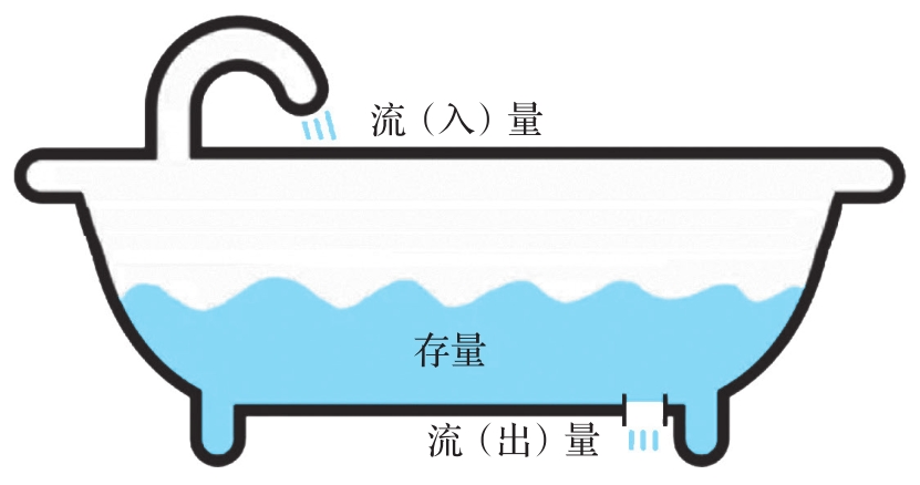 一旦加上时间轴,变量就会呈现出两种不同的状态:存量和流量。以浴缸为例,在一个浴缸中,“水”这个变量有两种不同的状态。一是存量,就是在一个“静止的时间点”,浴缸中存了多少水;二是流量,就是在一个“动态的时间段”,有多少水流入浴缸(流入量),有多少水流出浴缸(流出量)(见图2-7)。