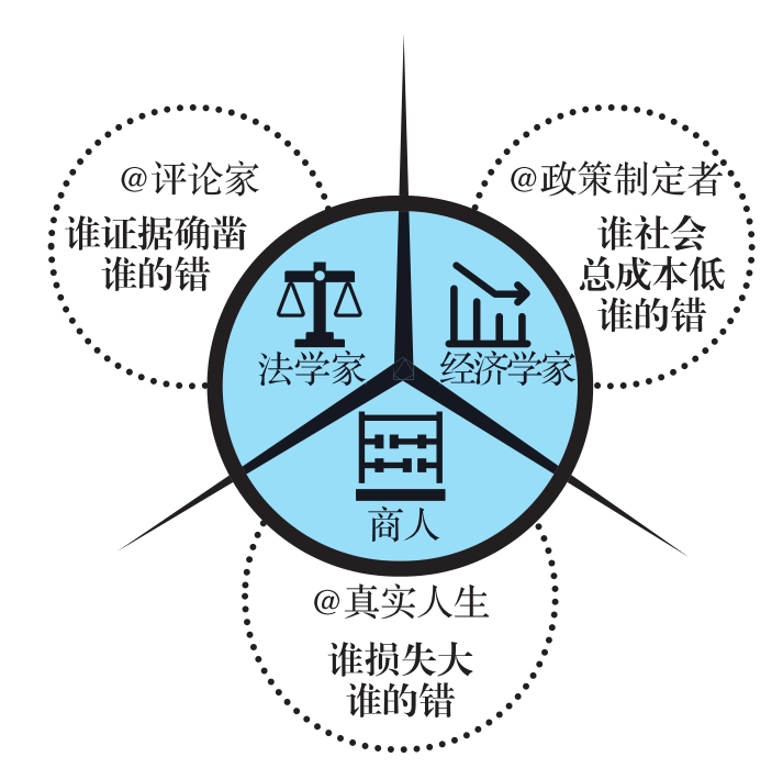 一个人心中,应该有三种“对错观”:①法学家的对错观;②经济学家的对错观;③商人的对错观(见图1-1)。