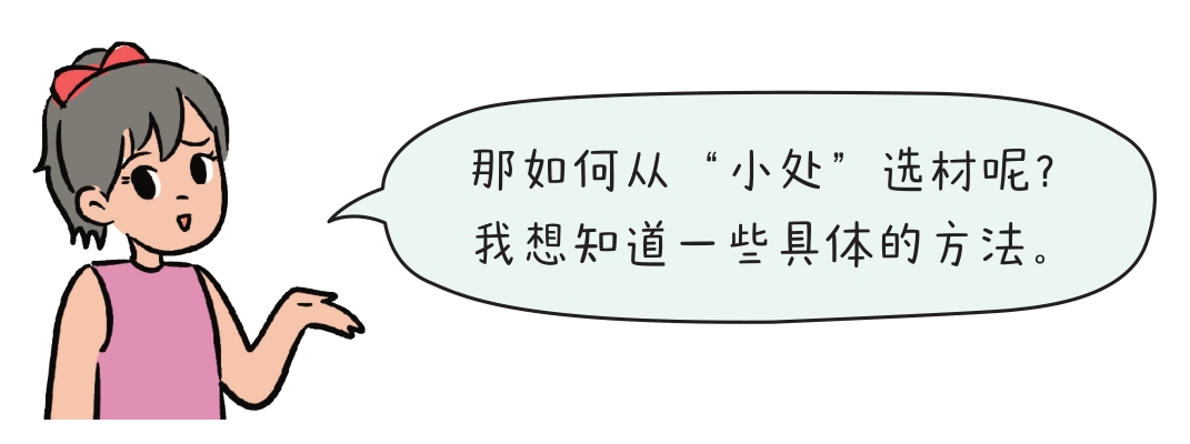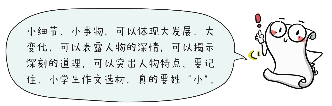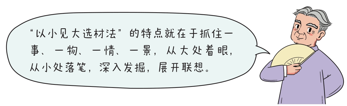从“小”处选材,不是不写大事,而是通过小题材、小事件和小细节,来揭示大主题,反映深刻的内容。在写作中,这叫“以小见大”。