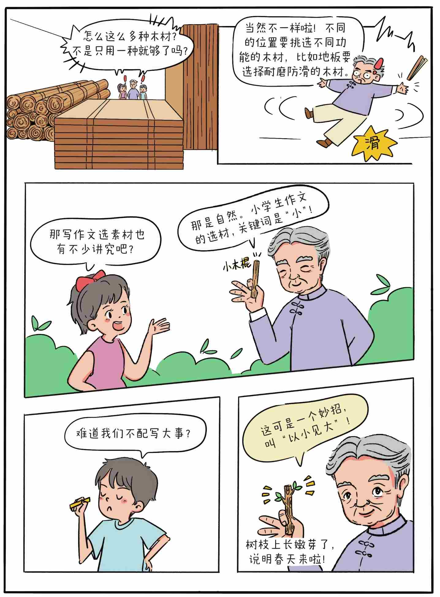 “巧爷,盖房子选木材有讲究,那写作文选材料又有哪些讲究呢?我猜,您肯定把这些知识给我们准备好了!”乐嘻嘻笑眯眯地看着巧爷,一副意料之中的表情。