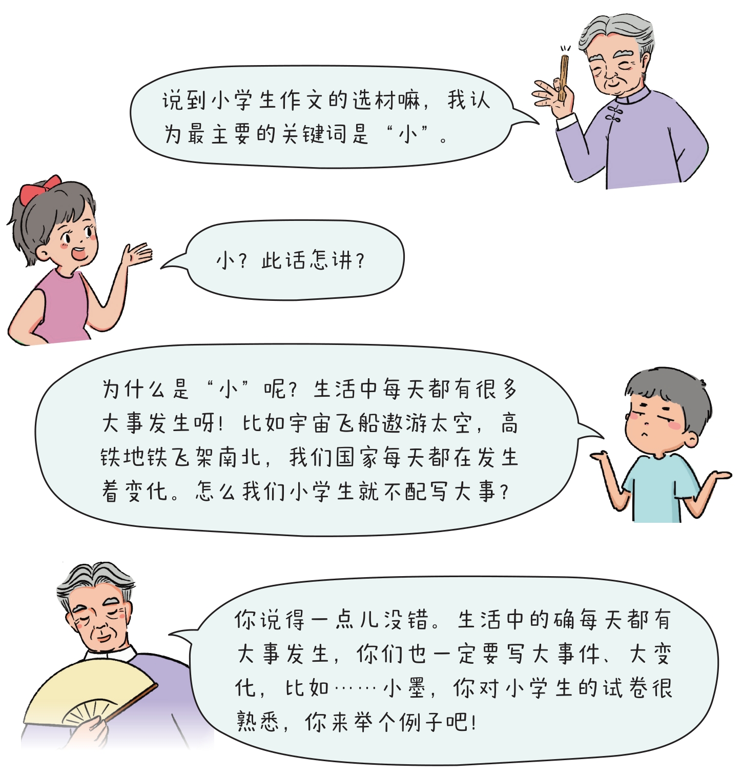 就以小墨刚才所举的征文为例,航天事业是大事,但离你们的生活很遥远。如果直接写,对你们来说很难。可你们想一想,航天事业中有没有一些小事件、小细节呢?