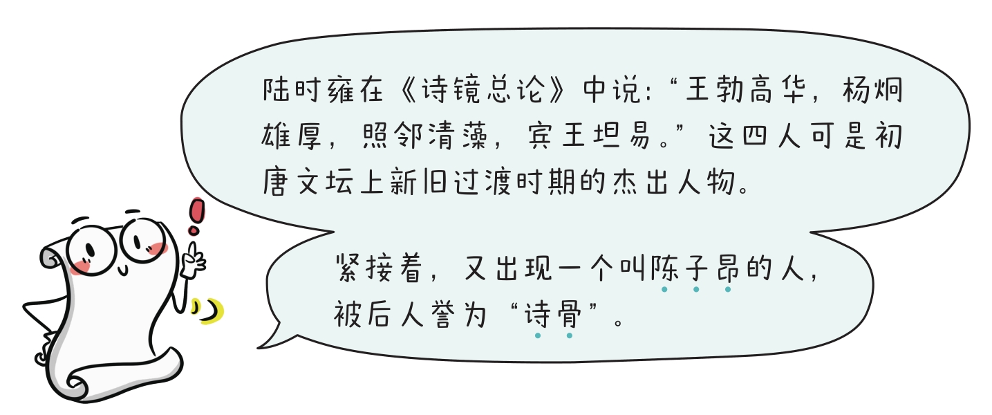 小墨惋惜地说:“他想带兵打仗,但得不到国家重用,心里很难过。不过他在诗歌上影响过很多人,这才是陈子昂的价值所在!而贺知章,则是一位承接初唐、盛唐的诗人……”