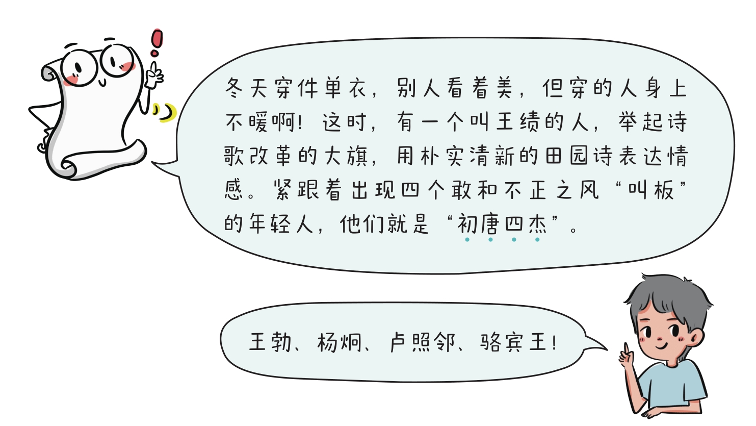 小墨赞许地点点头,继续说:“这四人虽过得不好,但都很有才。你们应该背过他们的很多诗,比如王勃的《送杜少府之任蜀州》,杨炯的《从军行》,骆宾王的《咏鹅》……”