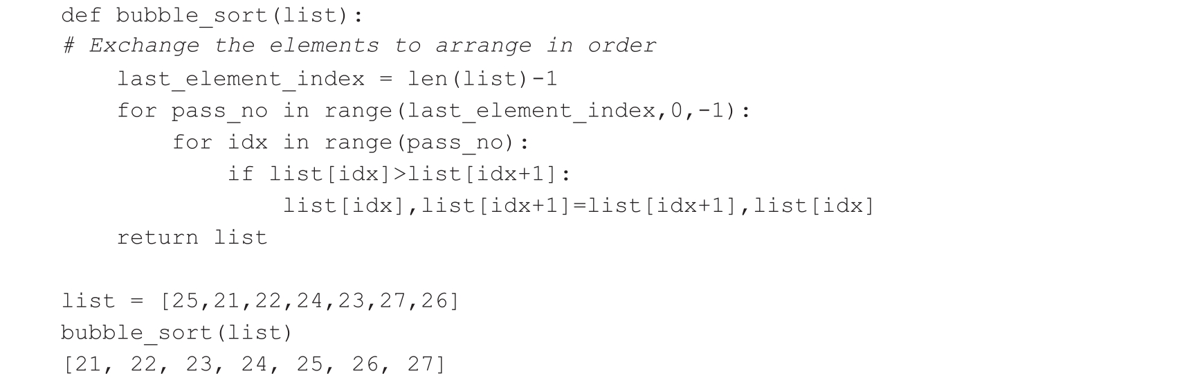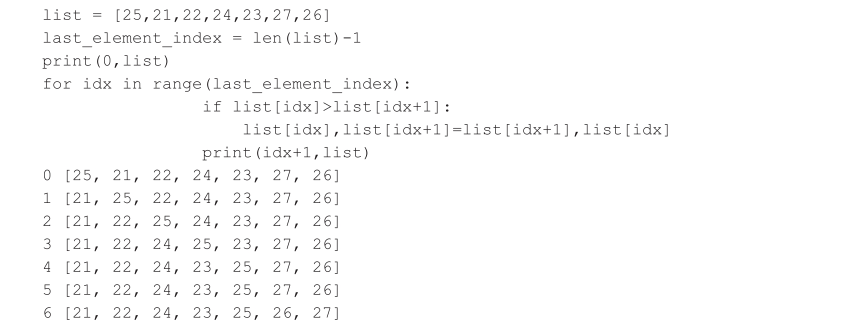 上面使用bubble_sort函数实现的冒泡排序是一种直接的排序方法,其中不断比较相邻元素并在它们的顺序不正确时进行交换。在最坏情况下,该算法始终需要 O ( N 2 )次比较和交换,其中 N 是列表中的元素数量。这是因为对于一个包含 N 个元素的列表,该算法无论列表的初始顺序如何都会经过 N -1次遍历。