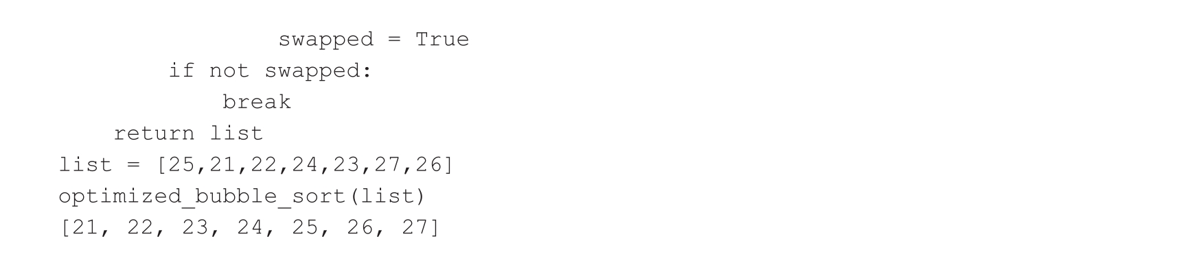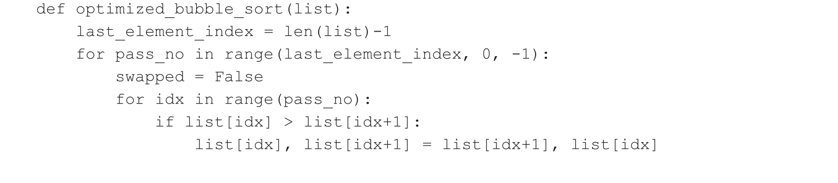 优化后的optimized_bubble_sort函数显著提升了冒泡排序算法的性能。通过引入一个名为swapped的标志位,这种优化允许算法在完成所有 N -1次遍历之前提前检测列表是否已经排序。当一次遍历完成且没有任何交换发生时,这清楚地表明列表已经排序完毕,算法可以提前退出。因此,尽管对于完全未排序或逆序列表,最坏情况下的时间复杂度仍然为 O ( N 2 ),但由于这种优化,对于已排序列表,最佳情况下的时间复杂度则提高到 O ( N )。