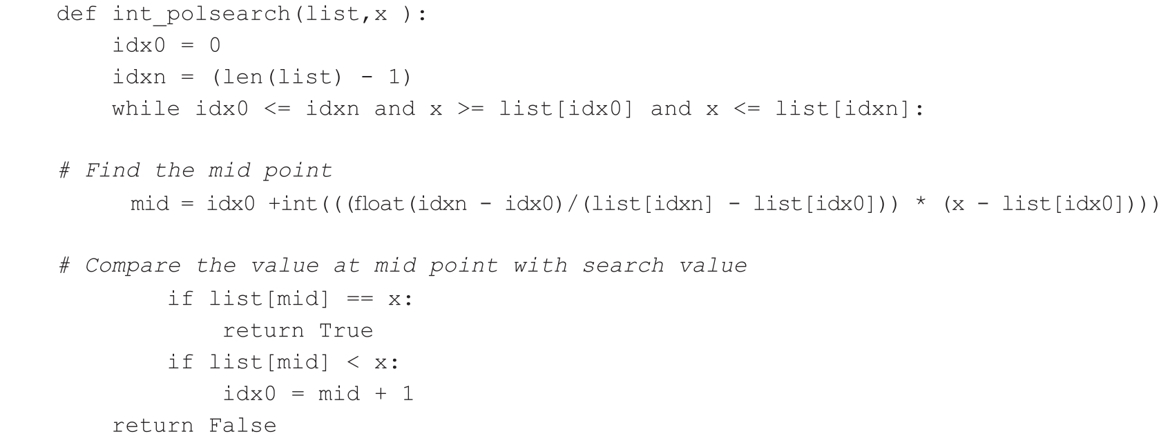 二分搜索基于将数据集中心作为关键点进行搜索。而插值搜索更为复杂。它利用目标值来估计已排序数组中元素的位置。让我们通过一个示例来理解它。假设我们想在英文字典中搜索一个单词,比如“river”。我们将利用这个信息进行插值,并从以字母“r”开头的单词开始搜索。一个更加通用的插值搜索可以按照以下方式编程: