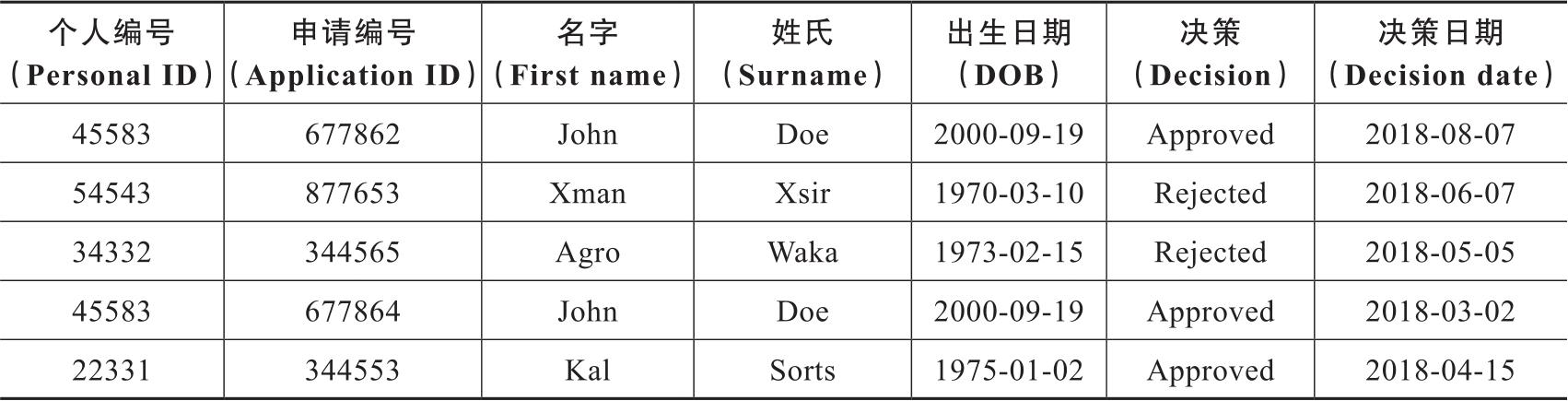 第二列是Application ID,每个Application ID都标识了系统中唯一的申请。一个人可能在过去申请过不止一次,因此,这意味着在历史数据库中,我们所拥有的不同的Application ID会比Personal ID多。如上表所示,John Doe只有一个Personal ID,却有两个Application ID。