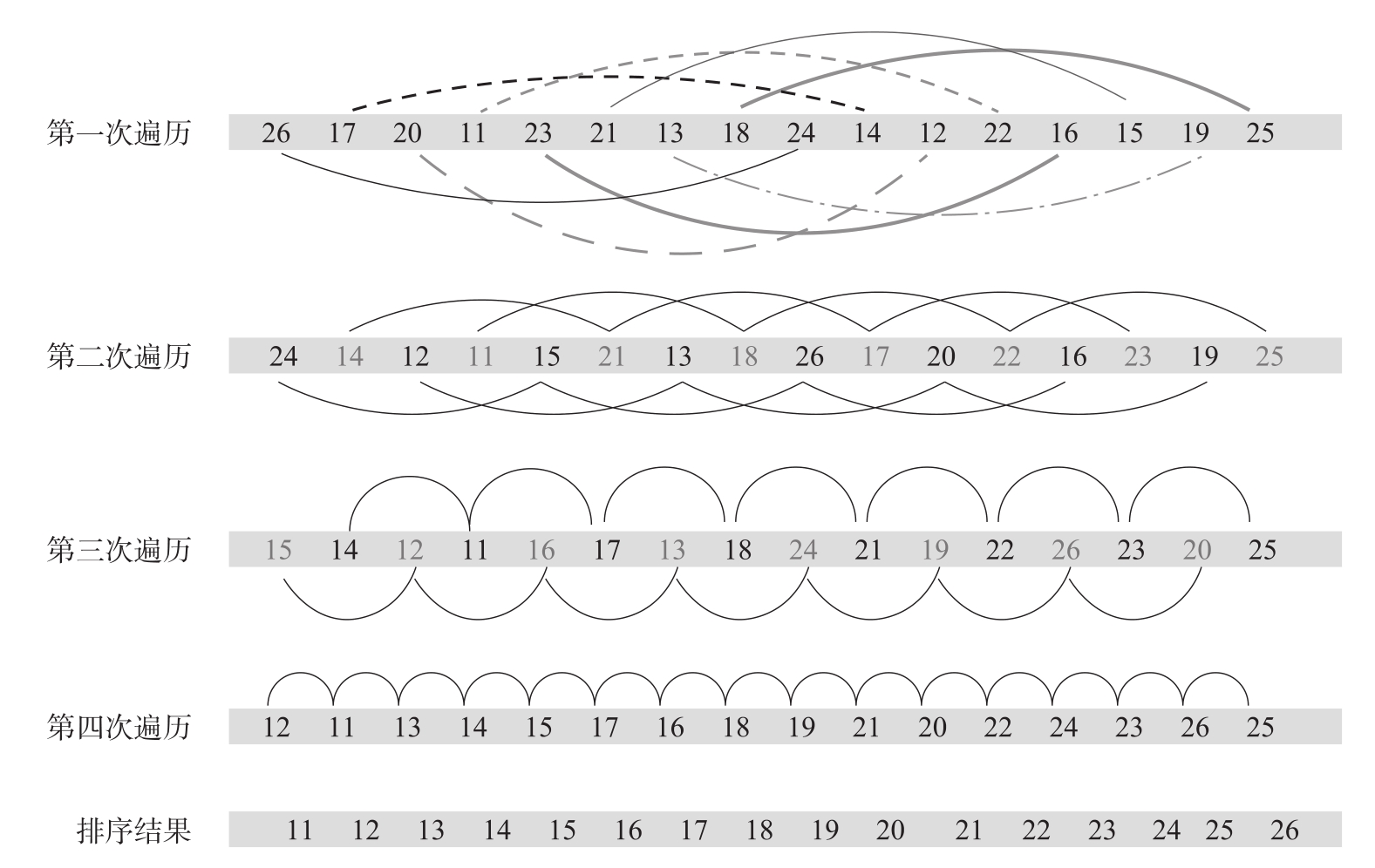 在第一次遍历中,我们不是选择相邻的元素,而是使用固定间隔的元素,最终对由一对数据点组成的子列表进行排序。这在图3.4中有所展示。在第二次遍历中,它对包含四个数据点的子列表进行排序(见图3.4)。在随后的轮次中,每个子列表中的数据点数目不断增加,子列表的数量不断减少,直到最终只剩下一个包含所有数据点的子列表。此时,我们可以认为列表已经被排好序了。