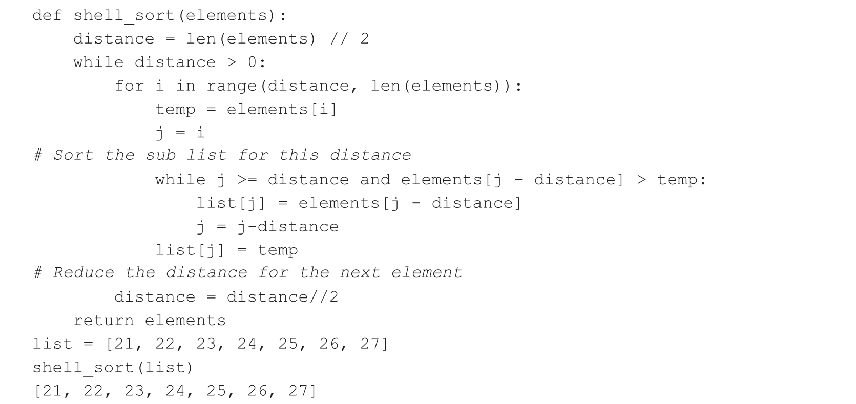 可以观察到,在最坏情况下,希尔排序算法需要通过两个循环,使其具有 O ( n 2 )的时间复杂度。希尔排序不适用于大数据集,而是用于中等大小的数据集。粗略地说,在包含多达6000个元素的列表上,它的性能相当不错。如果数据部分正确排序,性能会更好。在最佳情况下,如果一个列表已经排序好了,它只需要一次遍历 N 个元素来验证顺序,从而实现 O ( N )的最佳性能。