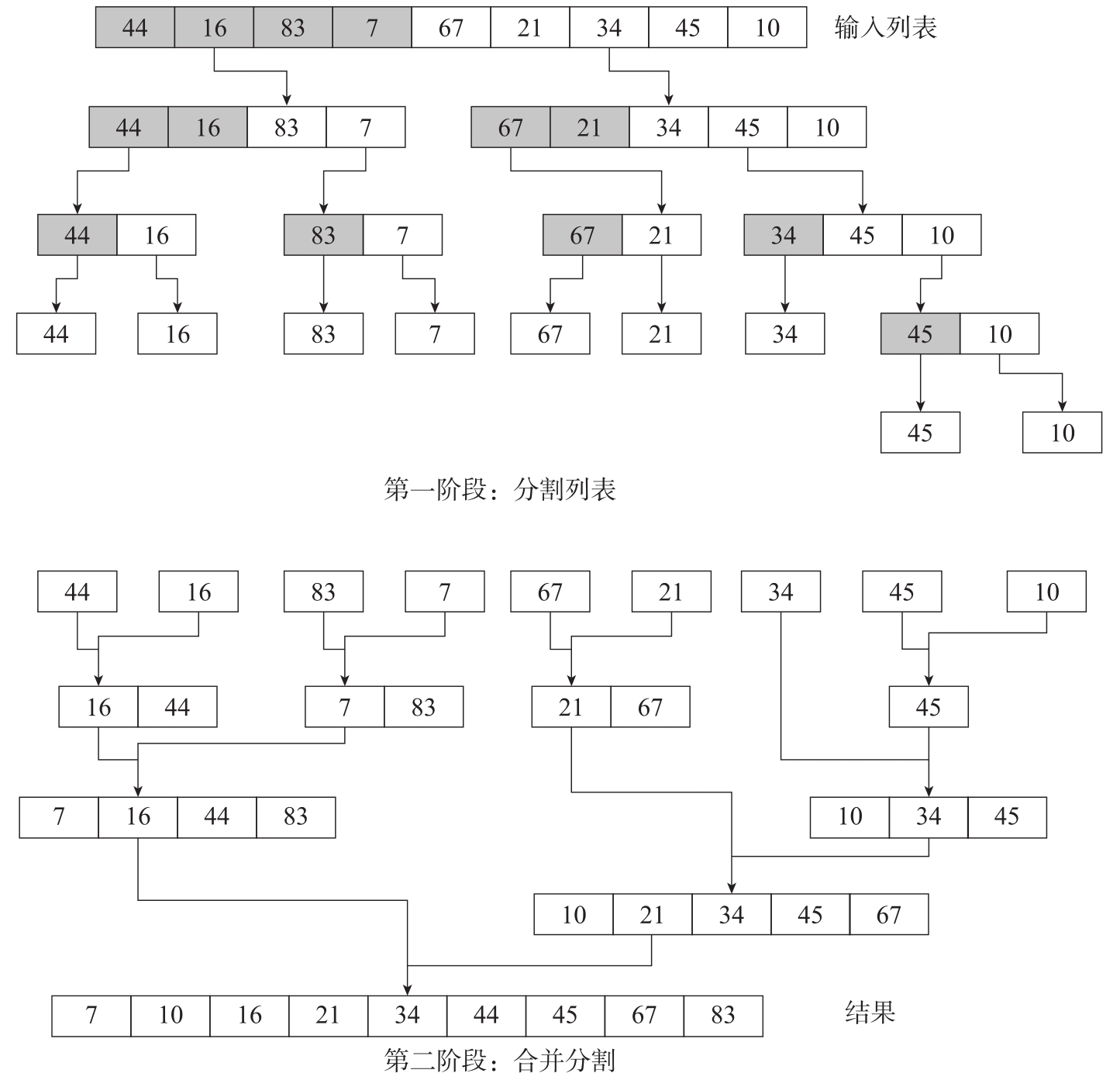 2) 合并阶段: 在这里,先前分割的部分被系统地合并。算法不断处理和组合这些部分,直到整个列表排序完成。