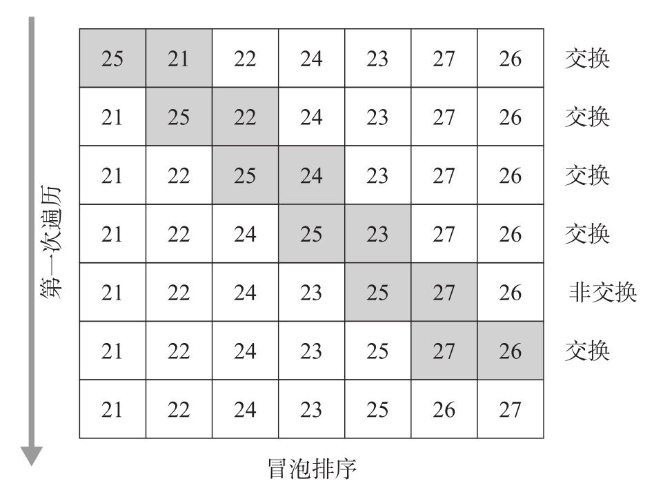 ❑ 在执行第一次遍历时,算法必须逐个比较列表的每个元素,以将最大值“冒泡”到顶部。