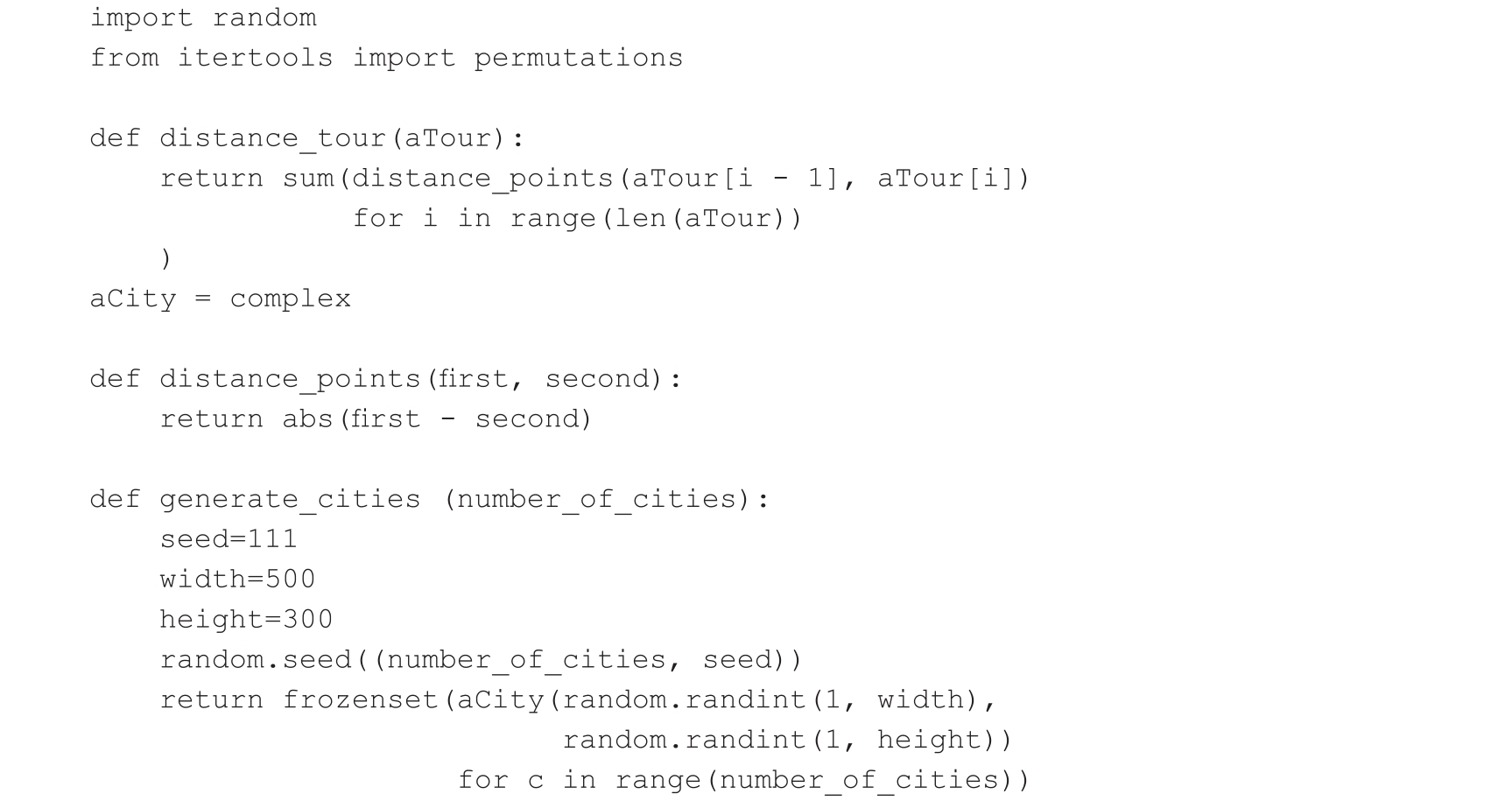 在上述代码中,我们利用了itertools包中permutations函数的alltours方法(用来生成所有城市的排列组合)。我们还使用复数来表示城市之间的距离。这意味着以下内容:
