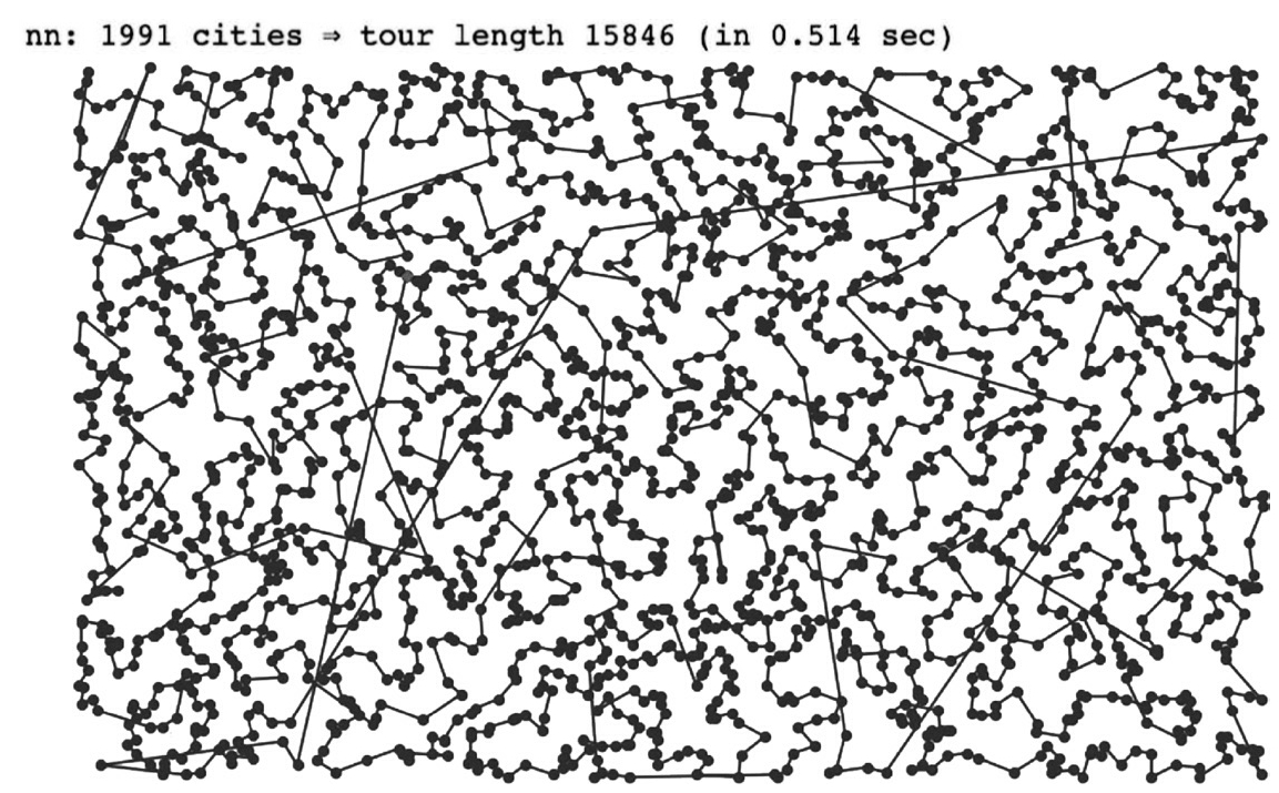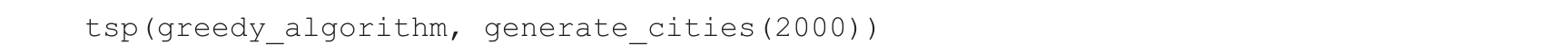 请注意,贪婪算法仅花费0.514s即可为2000个城市生成旅行路线(见图4.6)。如果我们使用蛮力法,它将会生成(2000-1)!=1.65e 573 种排列组合,这几乎是无穷大。