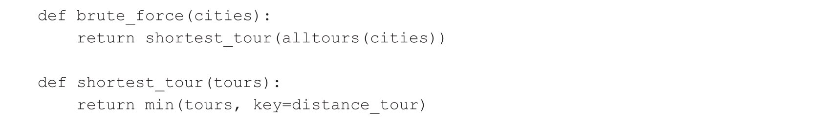 现在,我们定义一个函数brute_force,该函数会生成所有可能的城市旅行路线。一旦生成了所有可能的旅行路线,它将选择距离最短的路线: