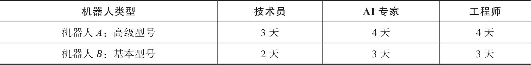 制造机器人需要三种不同类型的工人,制造每种类型的机器人的各类工人所需的确切天数如下。