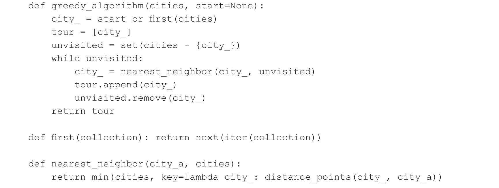请注意,在图4.5中我们使用tsp函数生成了10个城市的旅行路线。当 n =10时,它将生成(10-1)!=362880种可能的排列组合。如果 n 增加,排列组合的数量就会急剧增加,那就不能使用蛮力法了。