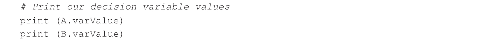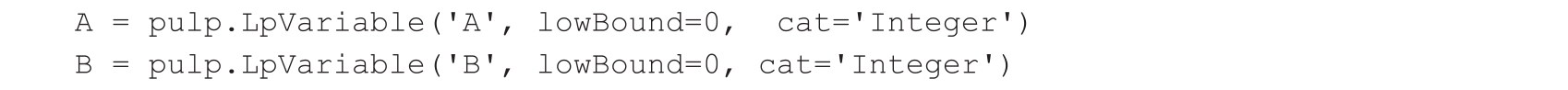 接着,我们定义两个线性变量 A 和 B 。变量 A 代表生产的高级型号机器人的数量,变量 B 代表生产的基本型号机器人的数量: