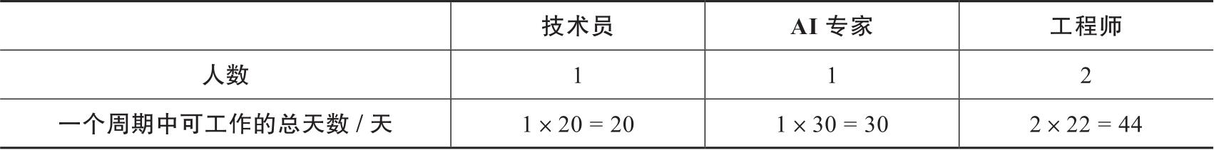 工厂以30天为生产周期。1名AI(人工智能)专家在1个周期内可以工作30天,2名工程师在30天内各休息8天。因此,每名工程师在每个周期内只能工作22天。在每30天的一个周期中,1名技术员可以工作20天。