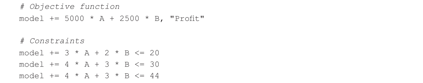然后,我们调用这个包中的LpProblem函数来实例化问题类。我们将这个实例命名为“Profit maximising problem”: