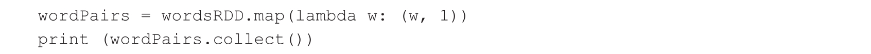 2)变换(Mapping) :可以在分区上独立运行的任何操作都称为变换。在图4.4中,变换操作将分区中的每个单词转换为键值对。对应于三个分区,有三个并行运行的变换器。