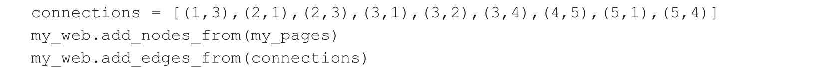 请注意,有一个网络来自https://networkx.org/。为了进行演示,假设我们只分析网络中的五个网页。让我们将这组页面称为my_pages,并且它们一起构成了一个名为my_web的网络。