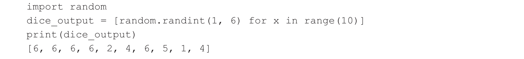 我们可以使用range()函数来生成一个随机数列表。例如,为了模拟一个骰子的十次试验,我们可以使用以下代码: