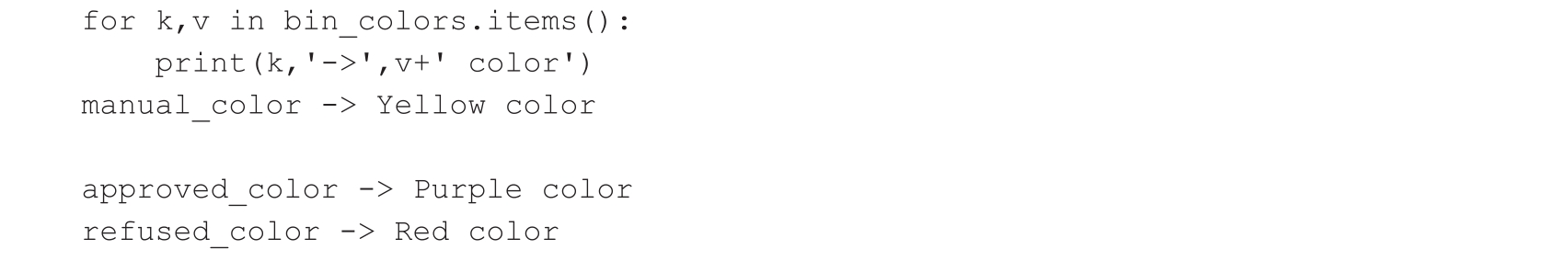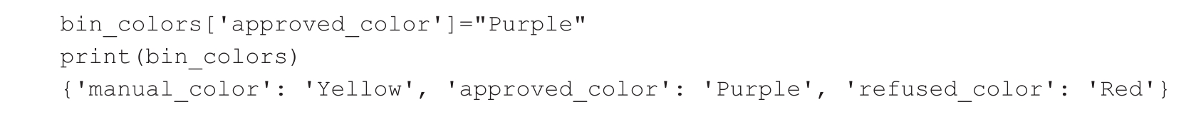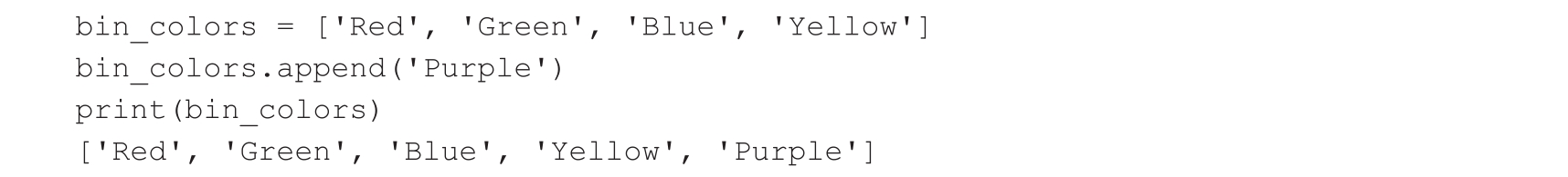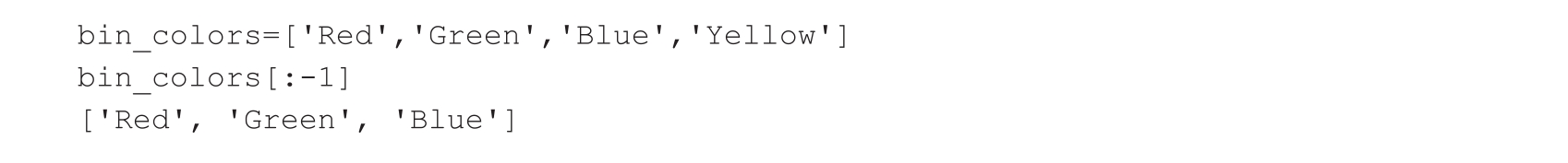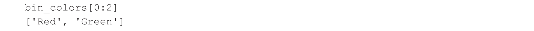 注意,Python是一种零索引语言。这意味着任何数据结构的初始索引都将为0,包括列表。Green是第二个元素,通过索引1检索,即bin_color[1]。