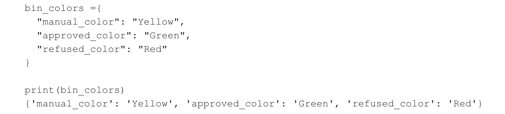 为了创建一个为各种变量分配颜色的简单字典,需要将键值对用{}括起来。例如,下面的代码创建了一个由三个键值对组成的简单字典: