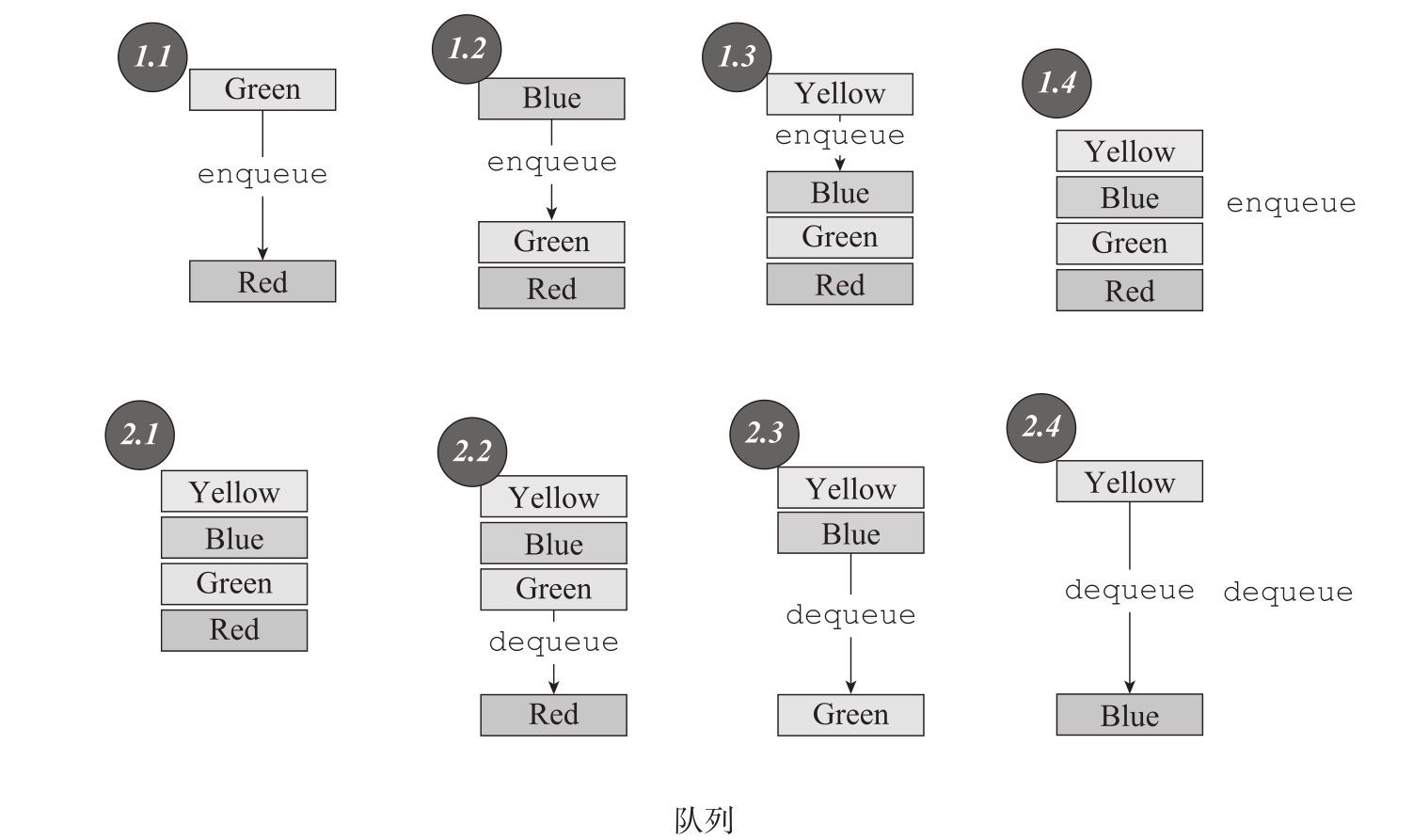 图2.5的顶部部分展示了入队操作。步骤1.1、1.2和1.3向队列中添加了三个元素,结果队列显示在1.4中。请注意,此时, Yellow 为队尾(Rear), Red 为队首(Front)。