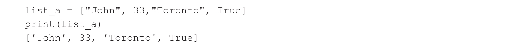 要创建一个列表,数据元素需要用[]括起来,并且需要用逗号隔开。例如,下面的代码创建了一个含有四个数据元素的列表,其数据类型不完全相同: