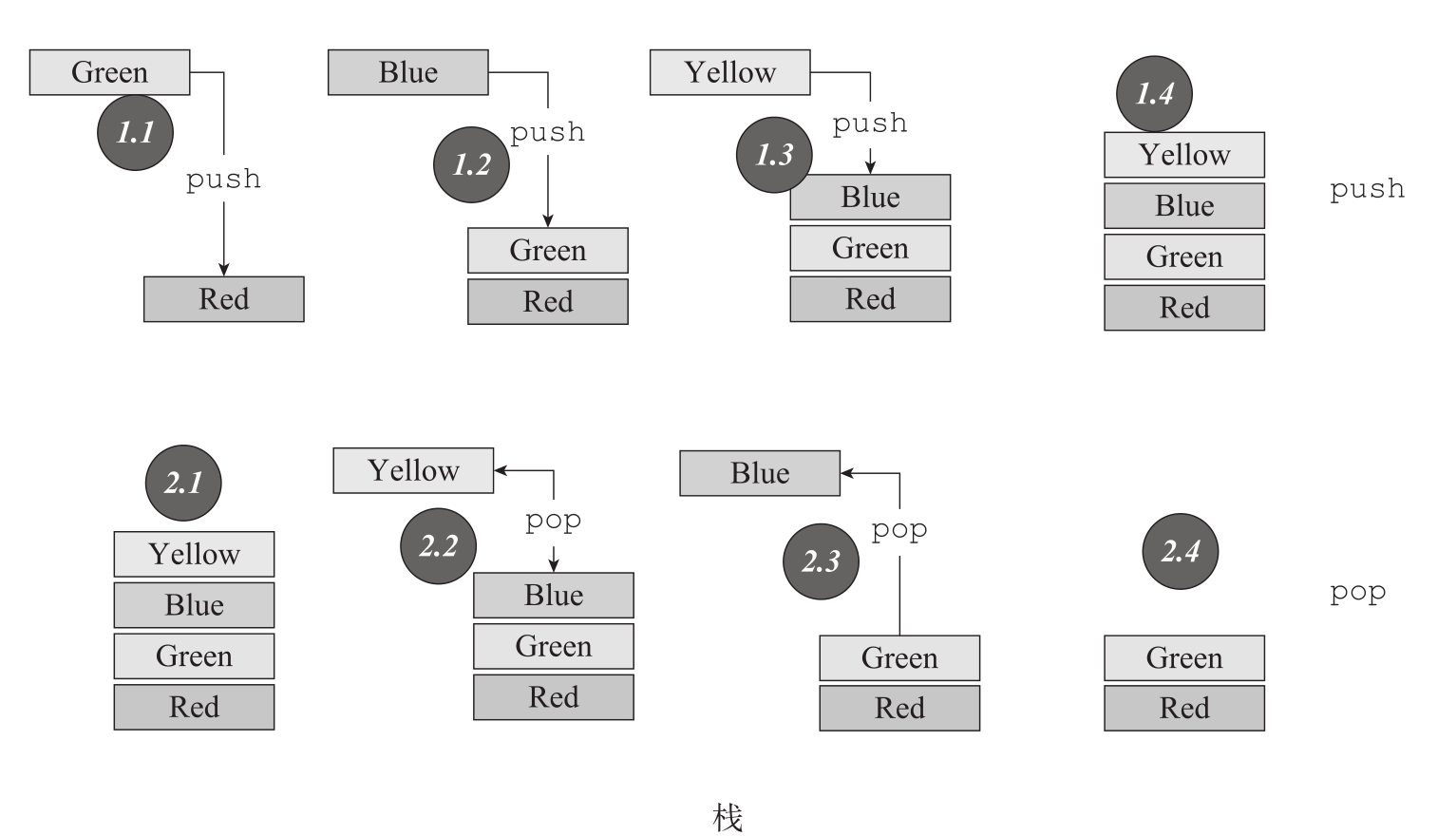 图2.4显示了如何使用推送(push)和弹出(pop)操作从栈中添加和删除数据。