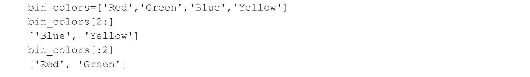 在对列表进行切片时,其切片范围如下所示:包含第一个数字而不包含第二个数字。例如:bin_colors[0:2]将包括bin_color[0]和bin_color[1],而不包括bin_color[2]。在使用列表时应注意这一点,因为Python语言的一些用户抱怨这不是很直观。
