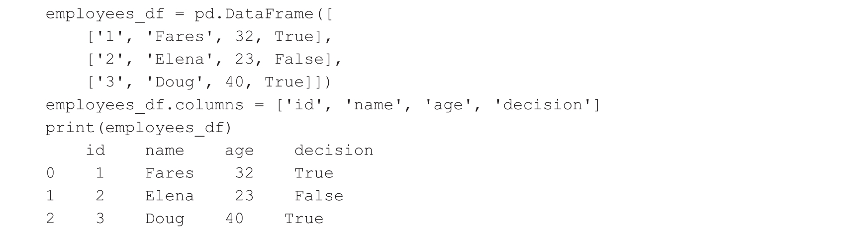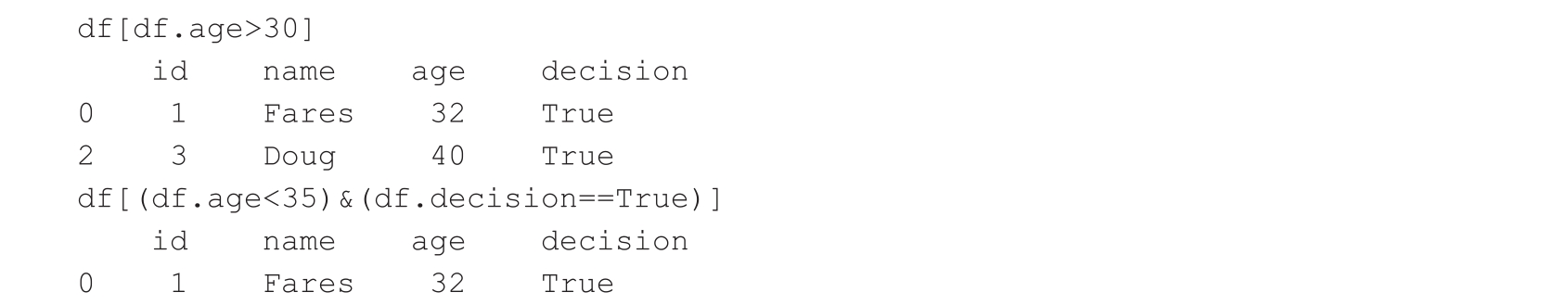 数据帧中的每一行都对应着我们问题空间中的一个数据点。如果我们想要创建问题空间中数据元素的子集,则需要执行选择行操作。这个子集可以通过使用以下两种方法之一来创建: