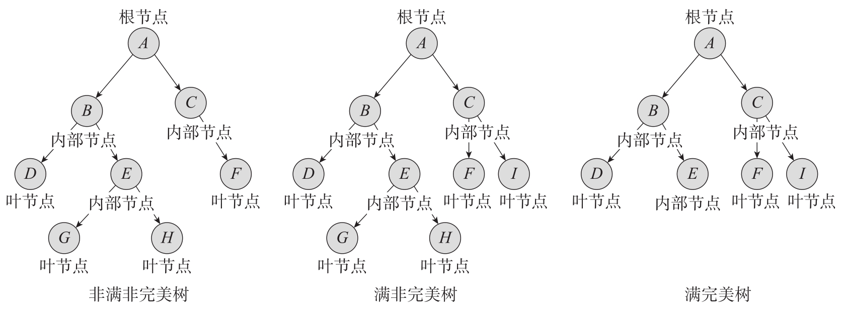 请注意,最左边的二叉树不是满树,因为节点 C 的度数是1,其他节点的度数都是2。中间的树和右边的树都是满树。
