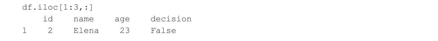 请注意,上述代码将返回第二行和第三行以及所有列。它使用了iloc方法,该方法允许我们通过其数值索引访问元素。