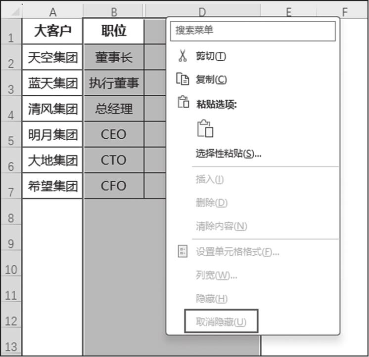 2)执行工作表保护后,选中包含隐藏列的位置(如B:D列)后单击鼠标右键,在弹出的快捷菜单中,“取消隐藏”命令是灰色的,无法执行相应操作,如图4-19所示。